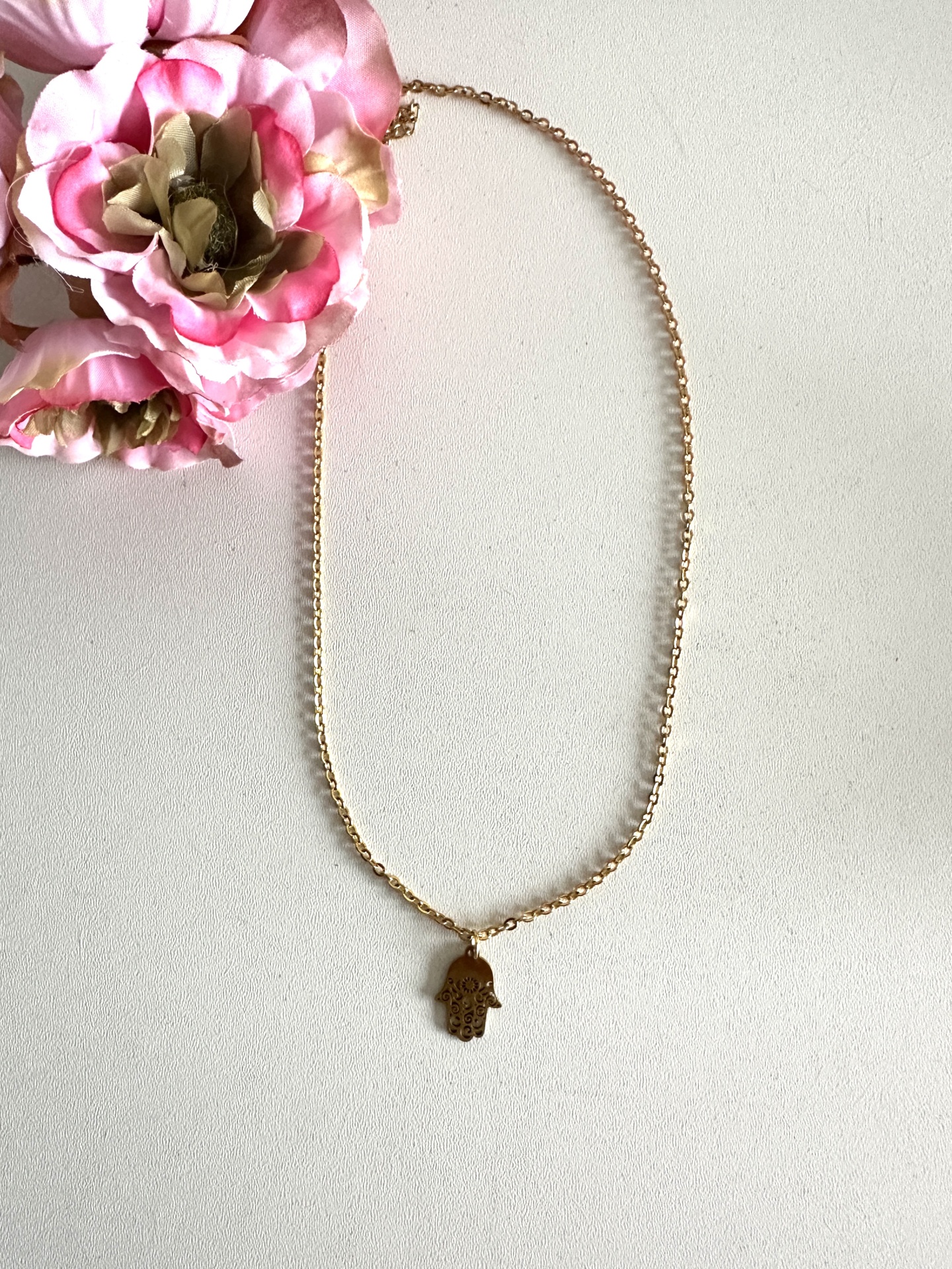 Detalhes, Material e Cor: Este fio é composto por uma delicada corrente em tom dourado, complementada pelo seu pendente, também em tom dourado, com o detalhe e o formato intrincado da Mão de Hamsá. O material utilizado é o aço, conhecido pela sua durabilidade e resistência, garantindo que o seu amuleto de proteção a acompanha por muitos anos sem perder o seu brilho.