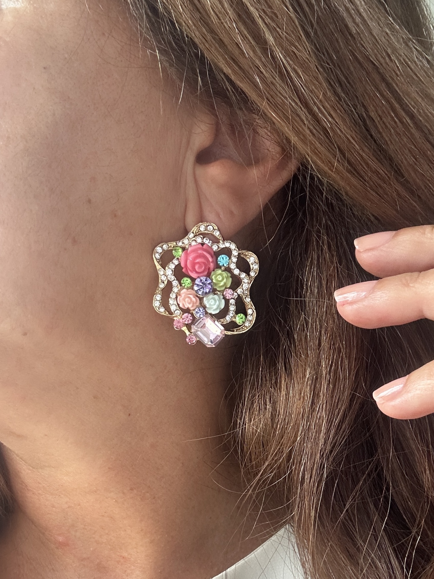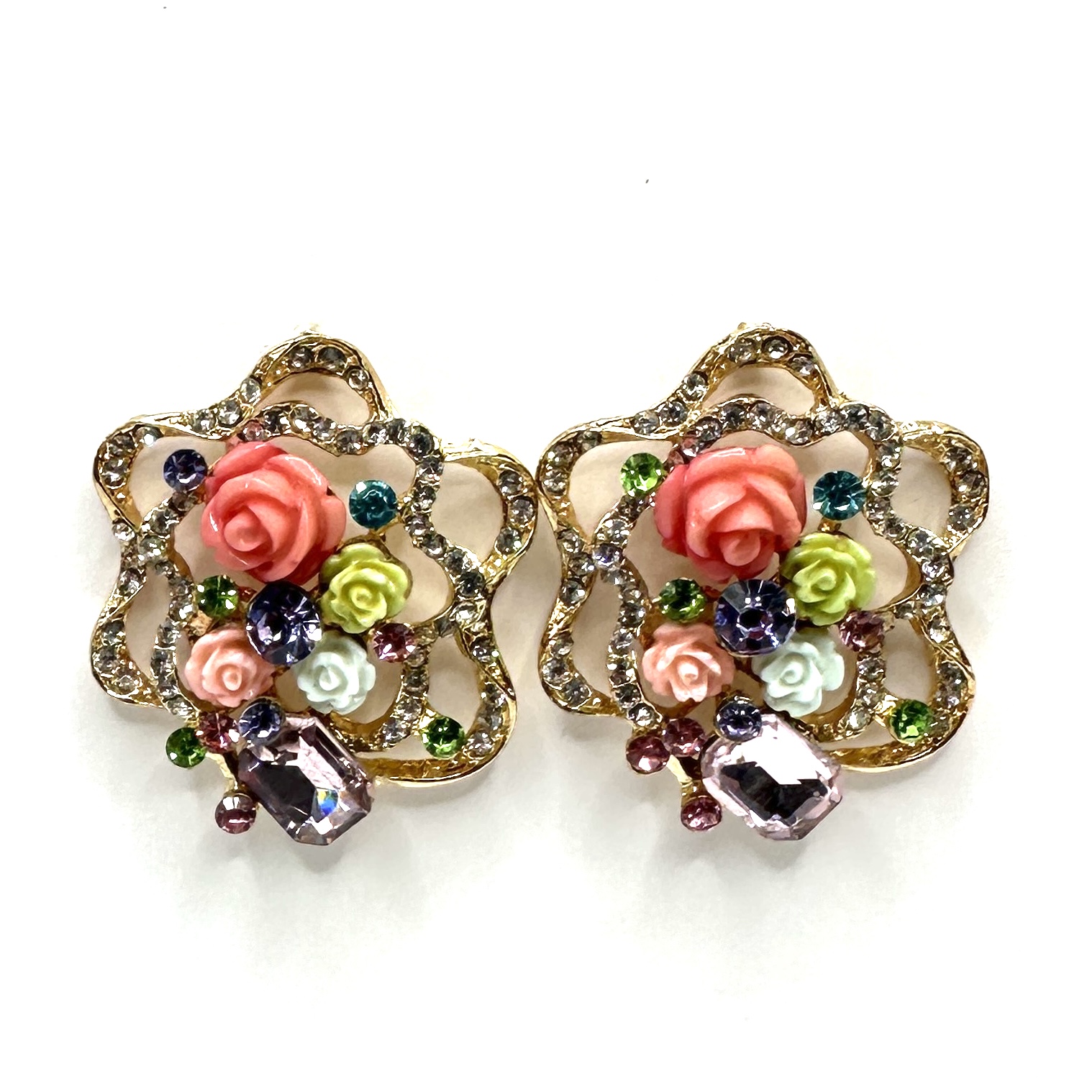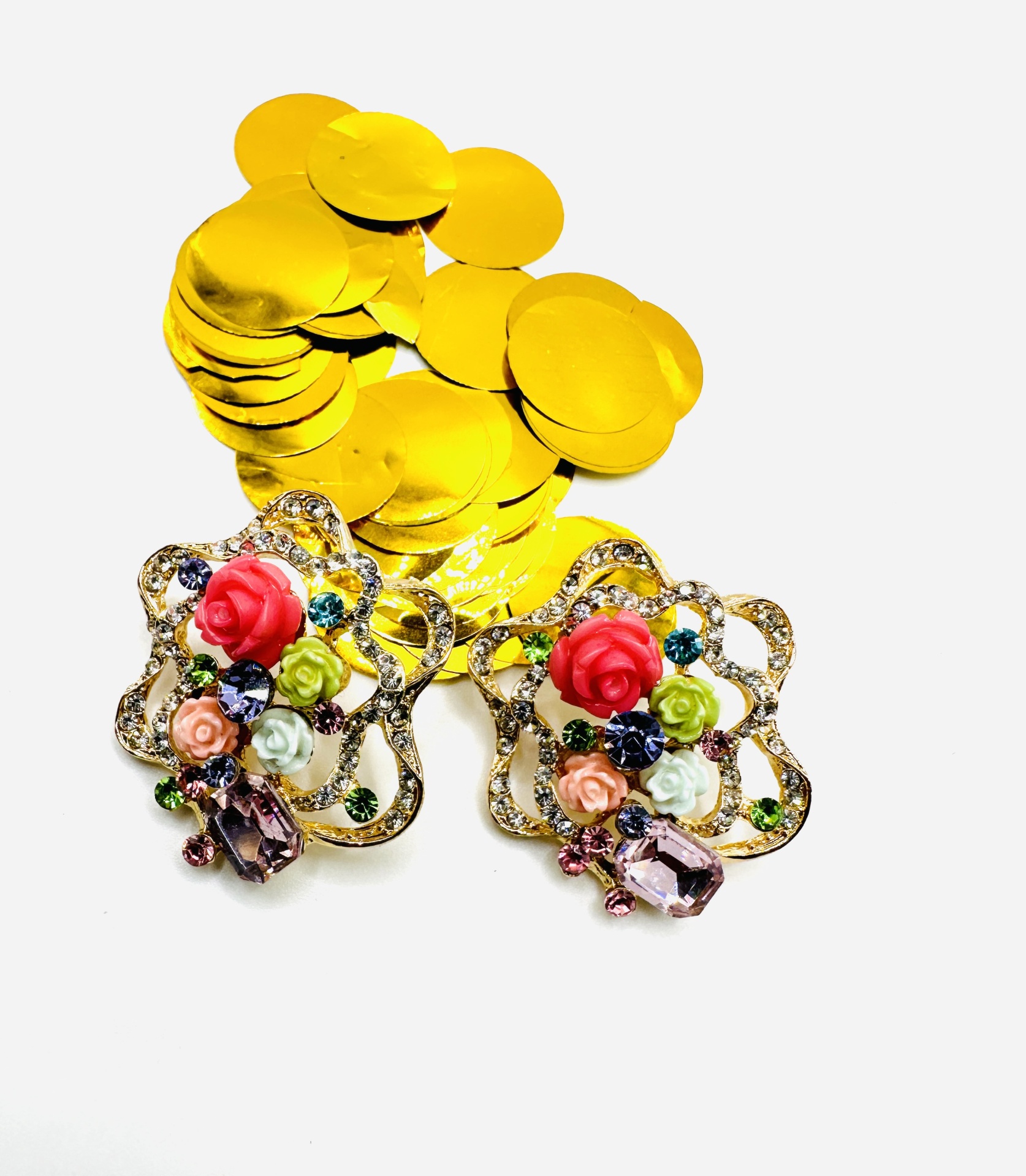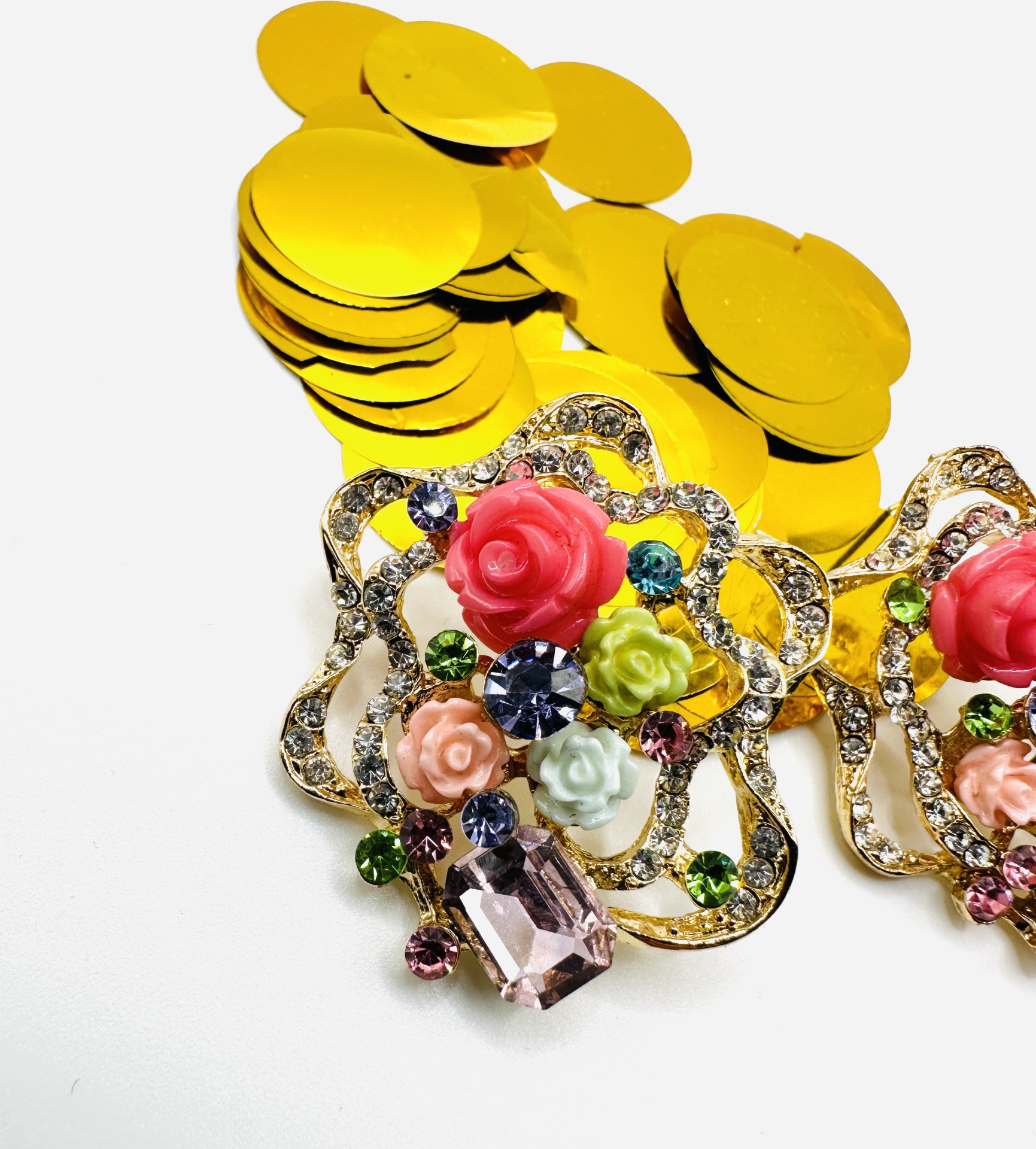 Brincos de estilo vintage com 4 cm e uma estrutura em metal dourado, adornados com flores coloridas em resina e cristais de vários cores. Cada brinco apresenta uma combinação charmosa de rosas em tons vibrantes, rodeadas por pequenos cristais alongados que realçam a peça com um toque sofisticado e romântico. O design floral e as pedras preciosas em diferentes cores conferem um visual único e intemporal, ideal para quem quer um acessório que se destaque.