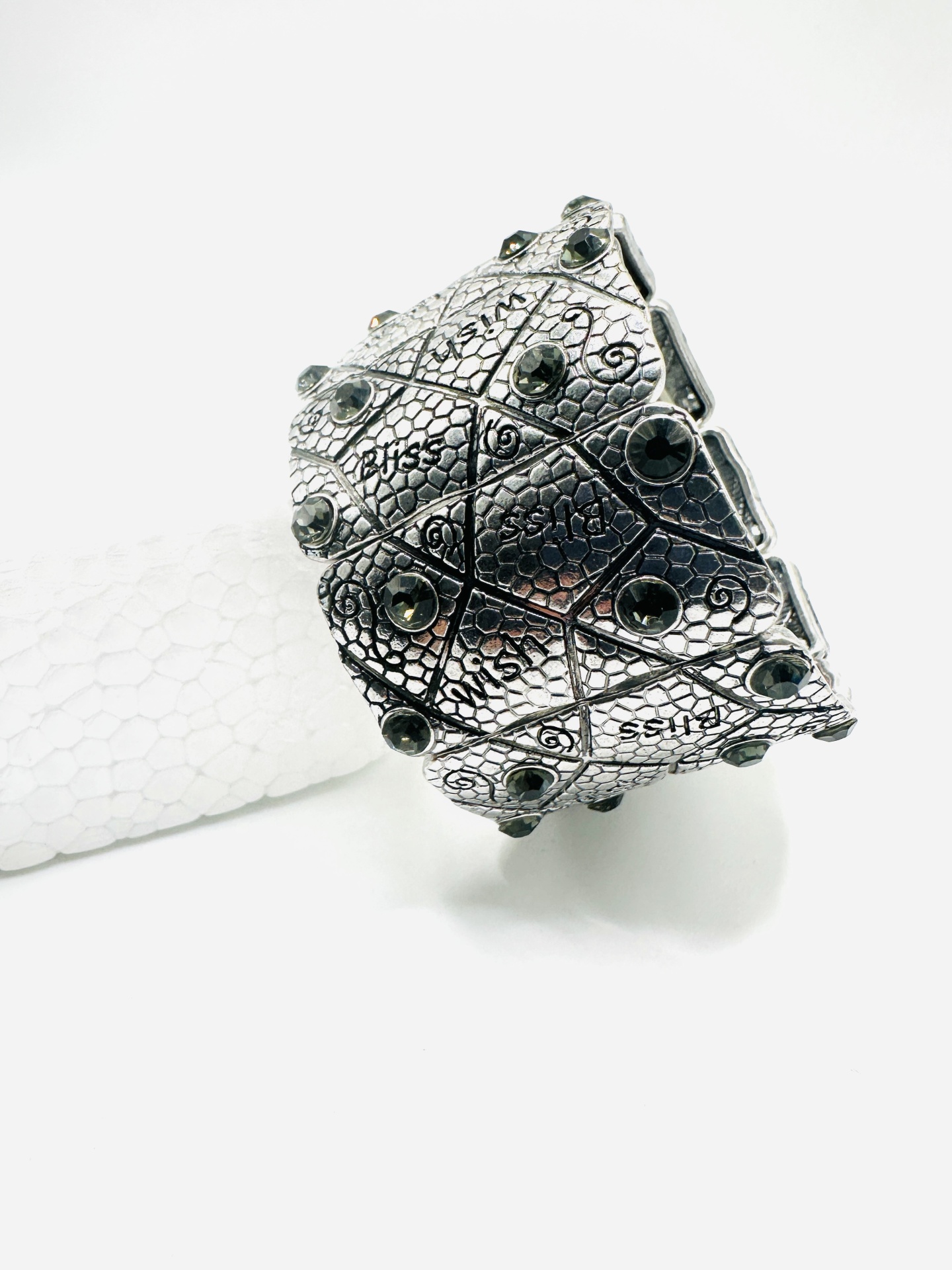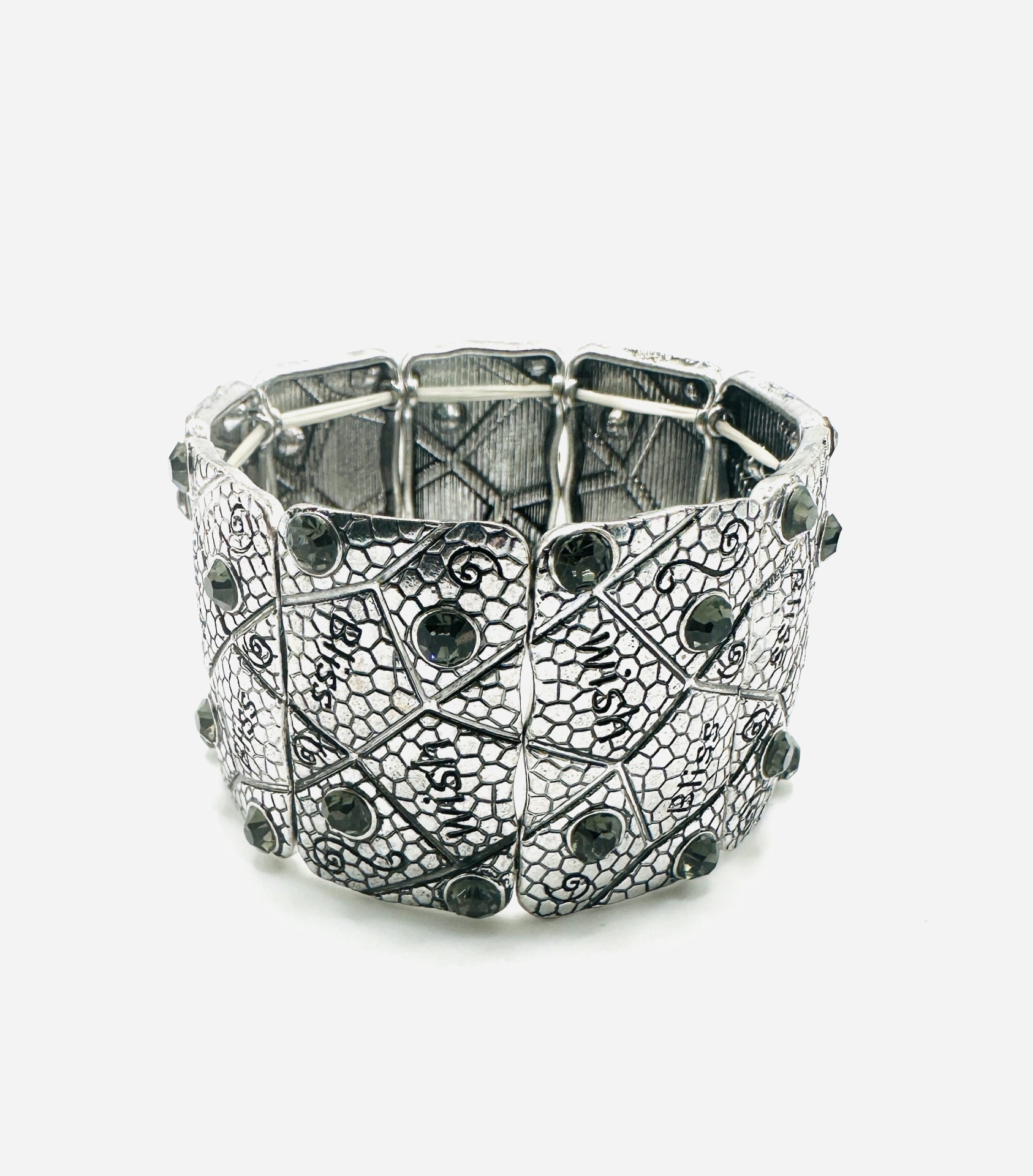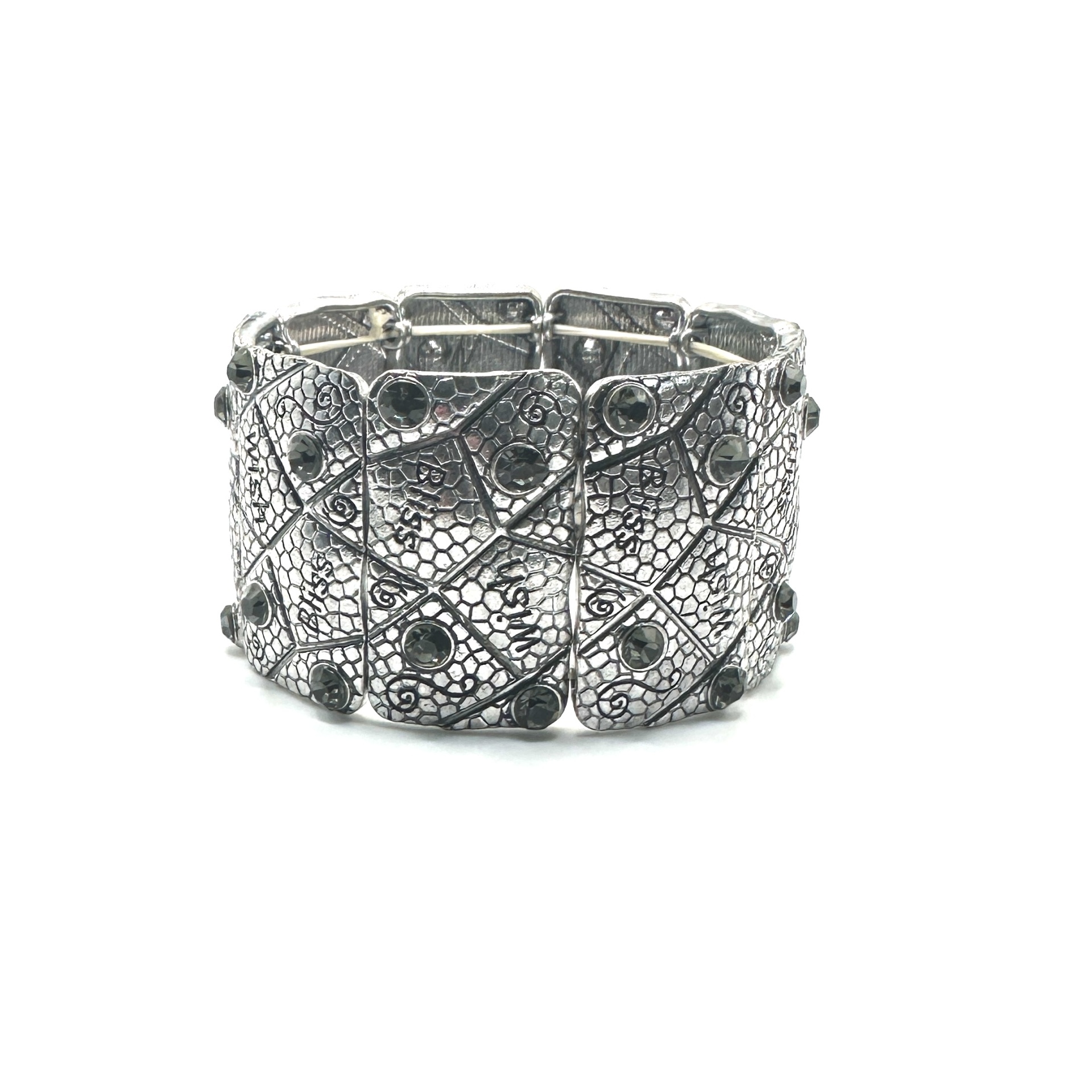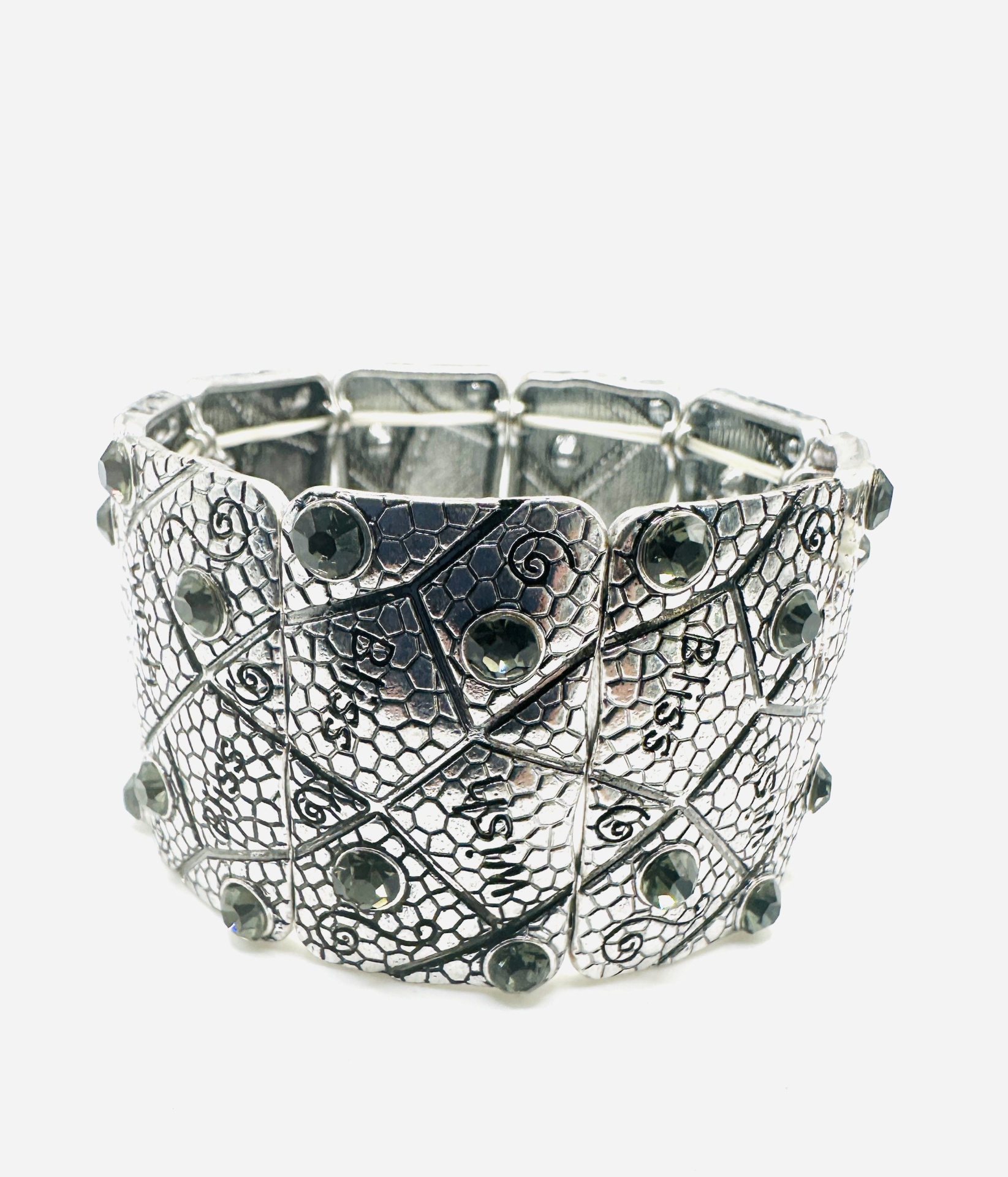 Apresentamos esta pulseira artística prateada, uma peça que se destaca pelo seu design detalhado e acabamento de alta qualidade. Com um padrão intrincado e pedras decorativas, esta pulseira é perfeita para adicionar um toque de elegância e sofisticação ao seu look.