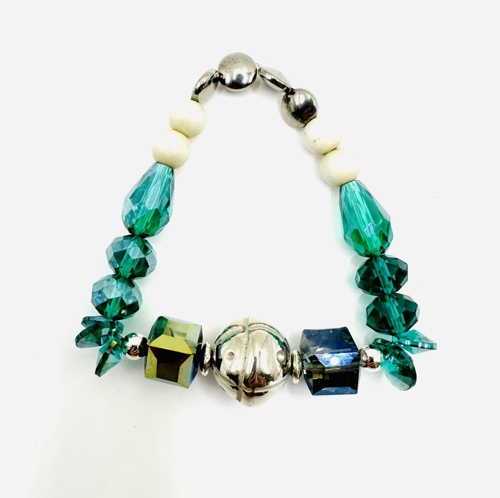 Material: Cristais verdes, contas prateadas, metal prateado.