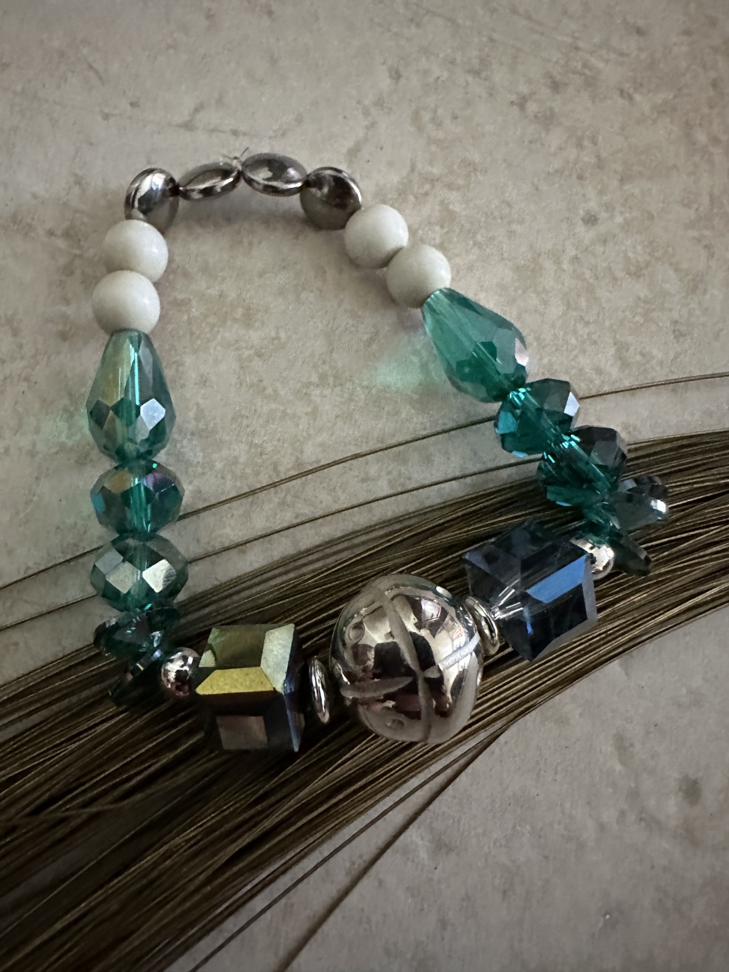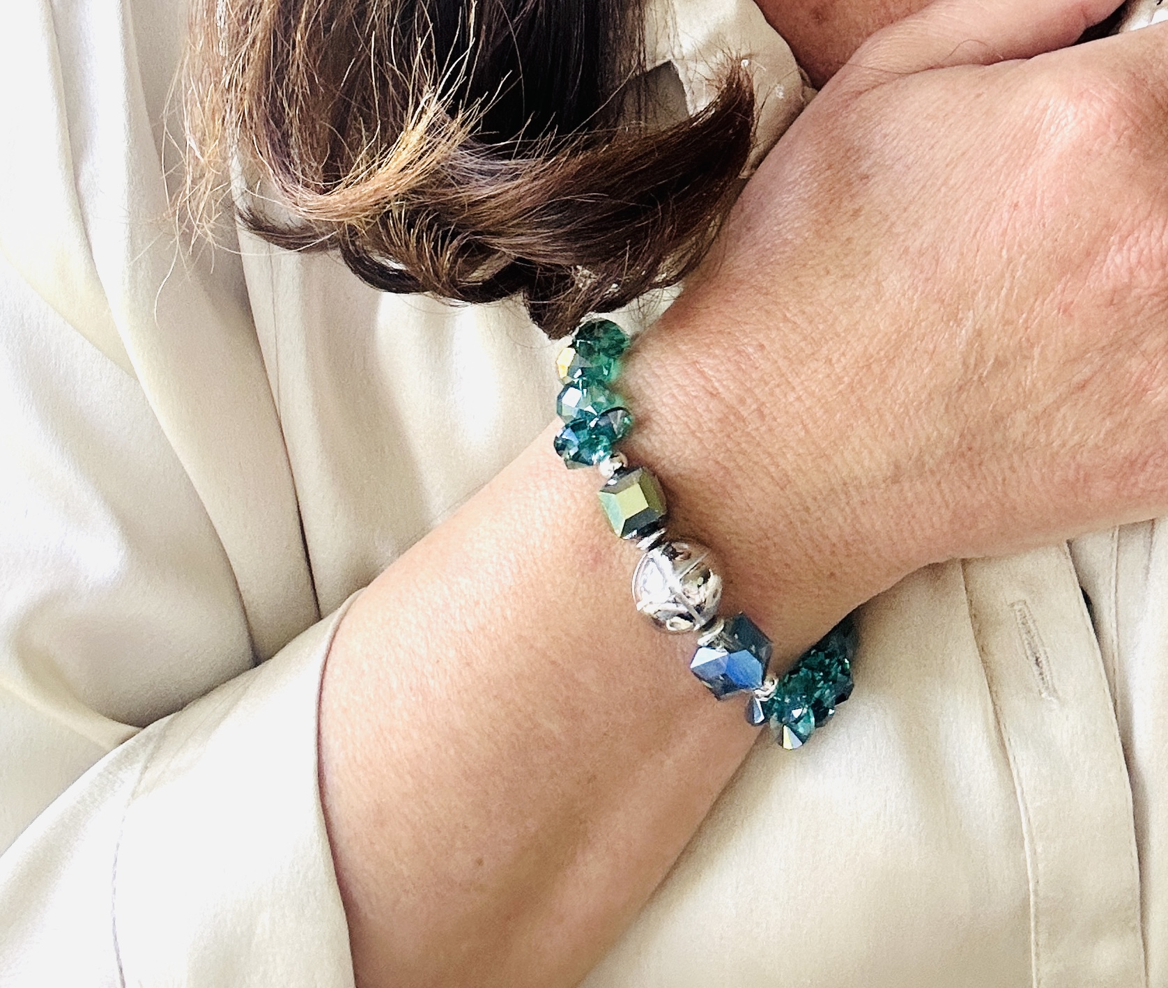 Cor: Verde (cristais), prateado (contas e metal).