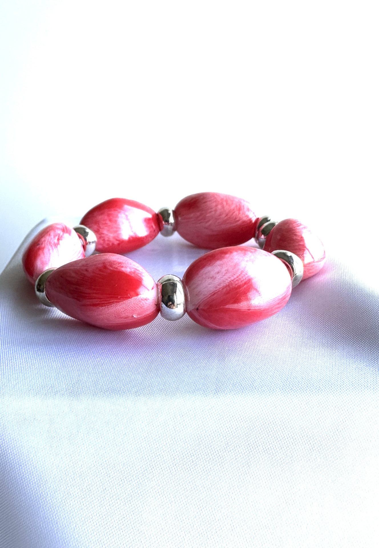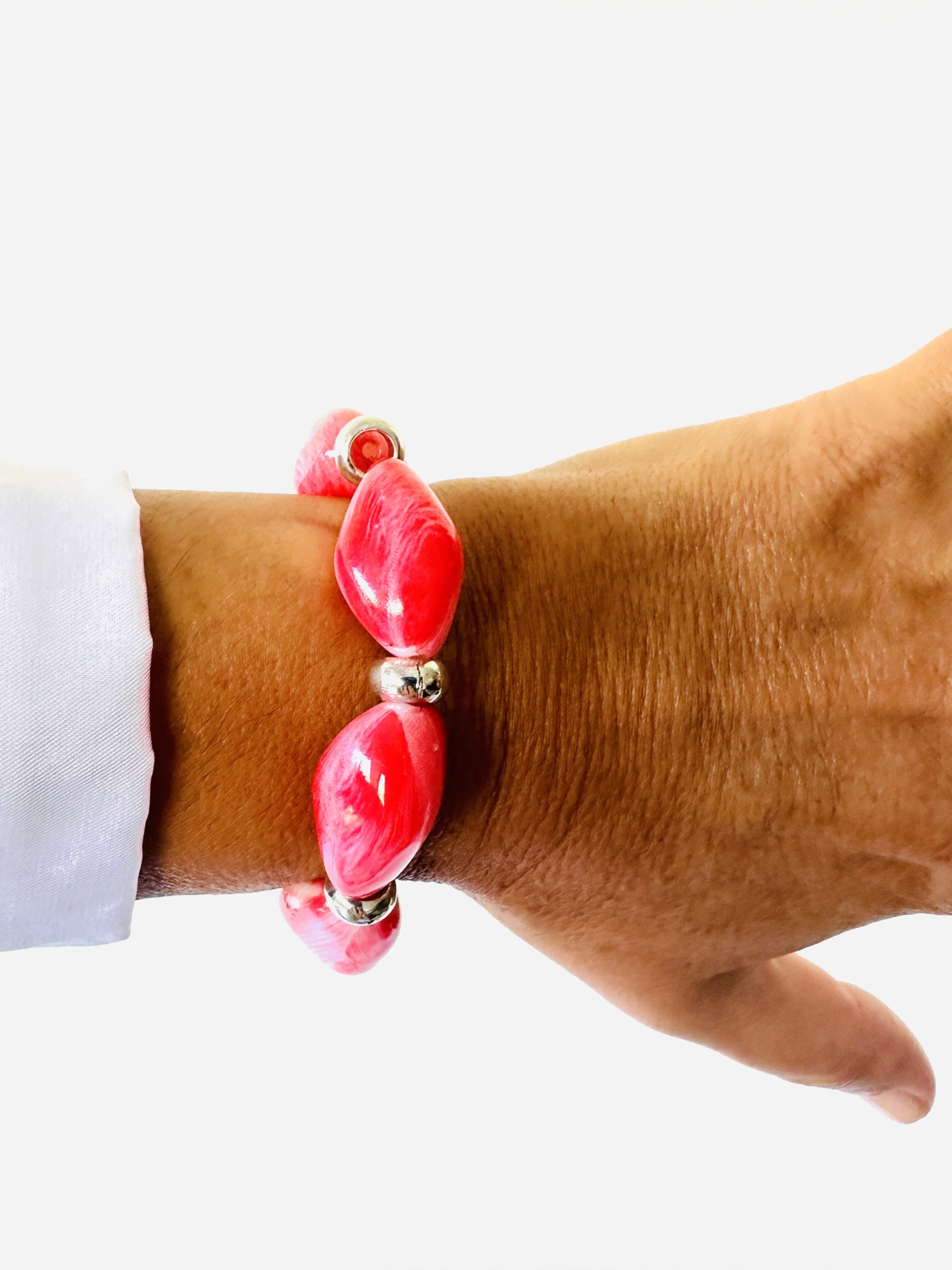 Esta pulseira elástica é composta por contas grandes e alongadas num vibrante tom fúcsia, com subtis veios mais claros que criam um efeito dinâmico e exclusivo. São inteligentemente intercaladas por pequenas contas redondas em metal prateado, que complementam a cor intensa. Por ser elástica, adapta-se com facilidade e conforto a diversos tamanhos de pulso. A intensidade da cor fúcsia e os seus veios podem apresentar pequenas alterações na tonalidade devido à luz das fotos, garantindo que a sua peça é única.